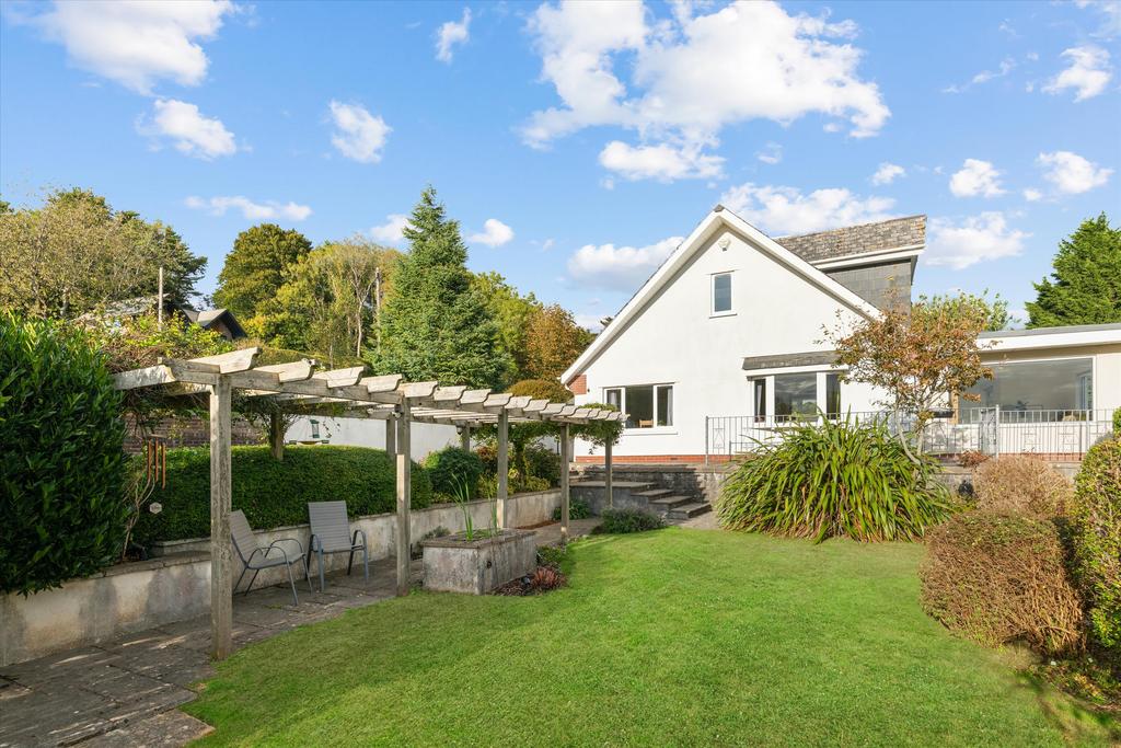 The property stands in a wide, mature plot with landscaped areas, lawn and established planting. A broad driveway leads to a double garage and offers extensive parking. The veranda and terrace take full advantage of the far-reaching views.