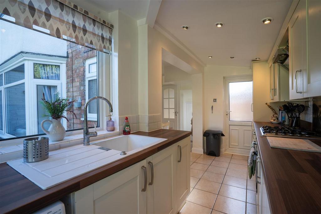 Perfect for families fitted with a range of wall, drawer, and base level units with work surface over incorporating sink with drainer and mixer tap over, gas hob with extractor hood over, oven, integrated fridge and freezer, space for further white goods, tiling to splash prone areas, double glazed windows to rear and side, central heating radiator, space for dining table and chairs, obscure double glazed door leading to front, and double glazed door leading to rear garden.