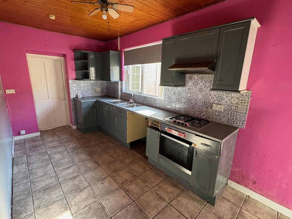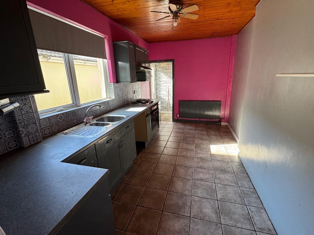 KITCHEN: 15'07'' x 8'05''-approx, -upvc d/g window to side elevation, a range of base & wall units with inset stainless steel sink & drainer, mixer tap, space for washing machine, 4 x ring gas hob [ not tested ] , oven [ not tested ], extractor fan [ not tested ]radiator, tiled floor. door into