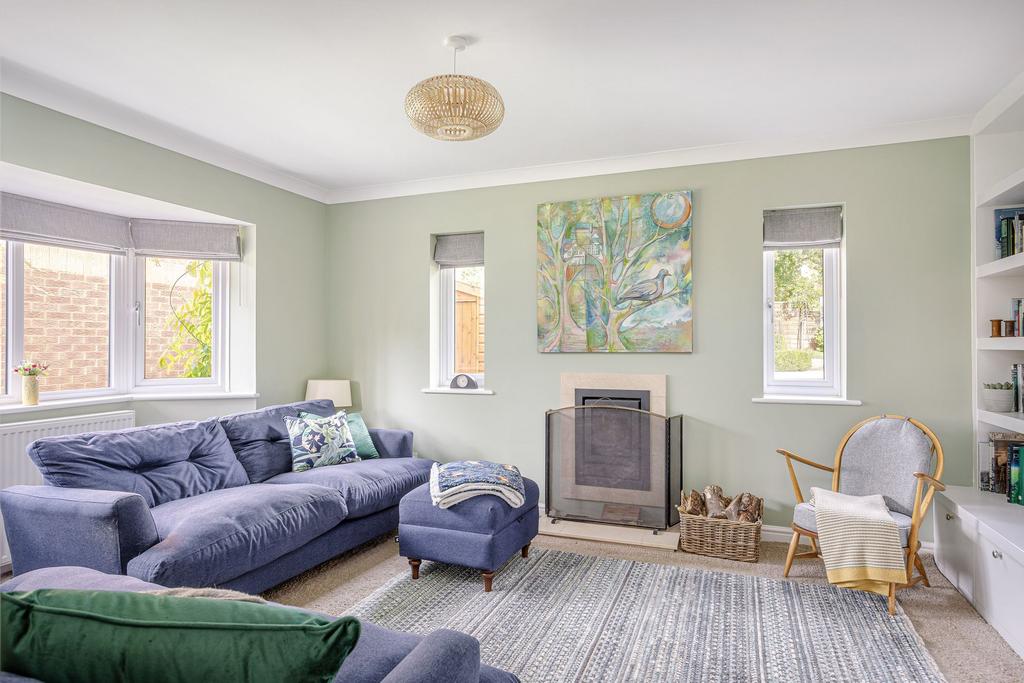 The kitchen, by locally renowned firm Goddard’s, features contemporary teal and grey cabinetry, Siemens appliances and a central island, opening through bi-fold doors to the garden and French doors to the terrace—ideal for entertaining. A cosy sitting room with a log-burning stove and a separate family room offer versatile living spaces.