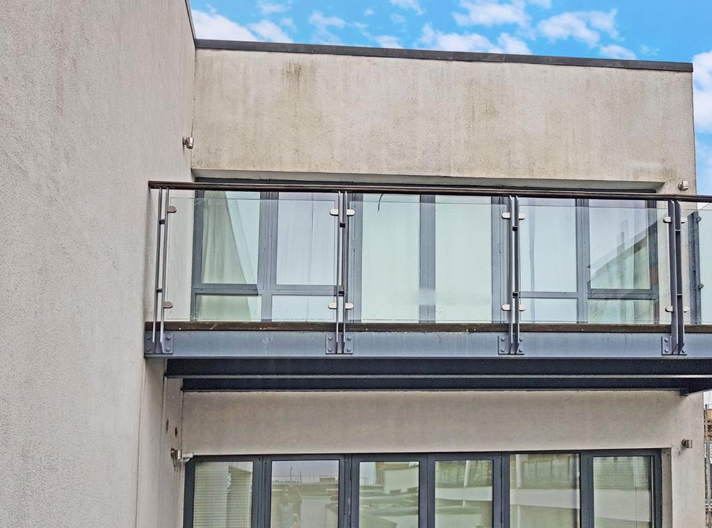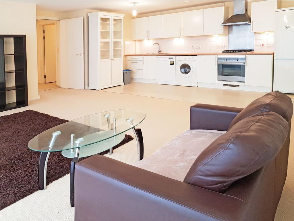 The property features a bright and spacious living room, with a private balcony, an open plan fully fitted kitchen, two generously sized bedrooms, and a contemporary bathroom. Large windows allow plenty of natural light to pour in, creating a warm and inviting atmosphere throughout the home.