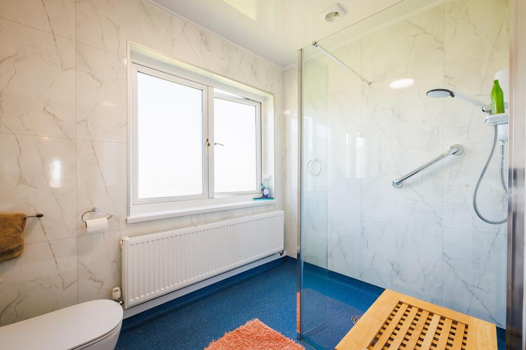 Found at the end of the first floor landing this large shower room has a walk in shower and a lavatory and hand basin set in a vanity unit. There is an obscured glass window to the side and the shower room has been finished with a waterproof membrane to the floor.