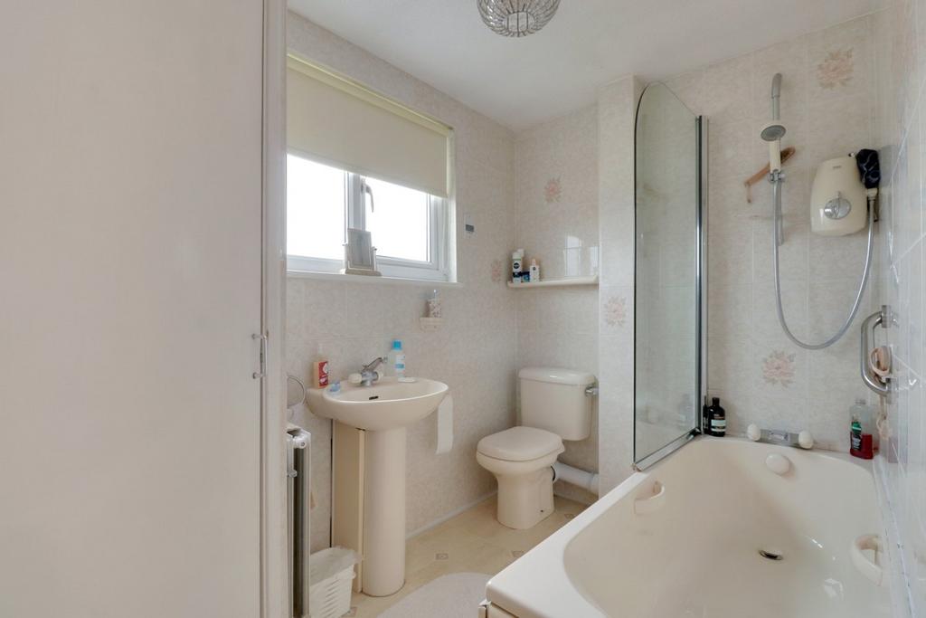 A part tiled room comprising bath with shower above and glass screen, low level W.C. and pedestal wash hand basin. Obscure double glazed window to front aspect. Door to airing cupboard.