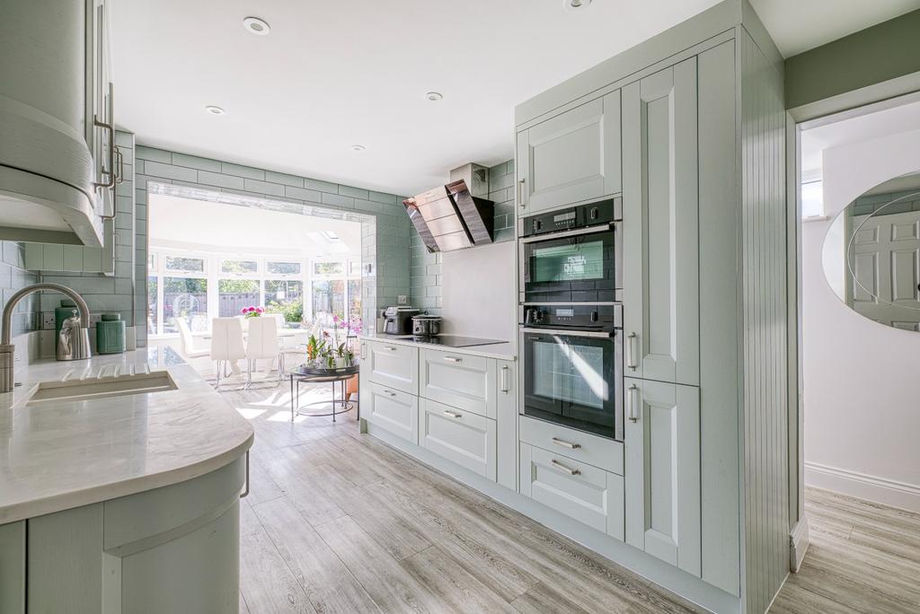 The kitchen opens directly into the outstanding garden/dining room, a wonderful addition to the house. With glazing on three sides, high sloping ceilings with skylights, and underfloor heating, this bright and airy space is ideal for both family life and entertaining. French doors open out to the landscaped garden.
