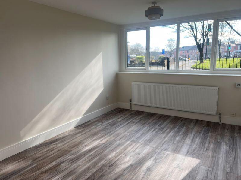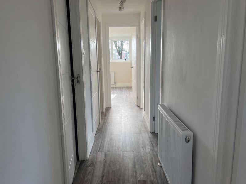 New fitted kitchen with modern base and wall cabinets. Space for a washing machine or dishwasher and fridge/freezer. Integrated eye level oven, hob and extractor fan. Breakfast bar. Subway style back splash tiles.