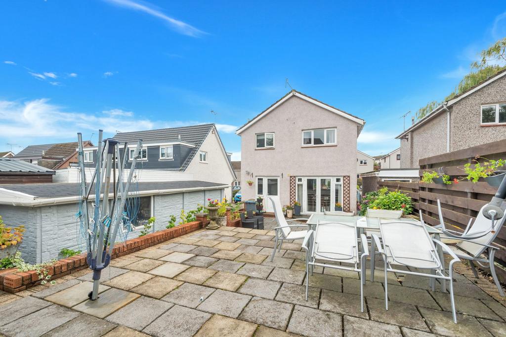 Outside, the tiered rear garden is thoughtfully designed with decorative tiling and a peaceful seating area at the top—an ideal spot to unwind. A driveway leads to a separate garage, and the front garden is neatly laid to lawn with surrounding flowers for added kerb appeal.