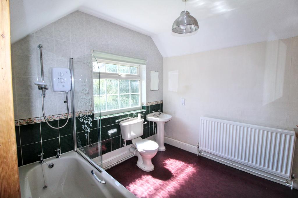 BATHROOM with vinyl floor, white suite with panelled bath with tiled surround, shower and screen. WC and washbasin with mirror and shaver point over. Window, radiator, period fireplace, airing cupboard with hot water cylinder and eaves cupboard housing the 'Potterton' gas boiler.