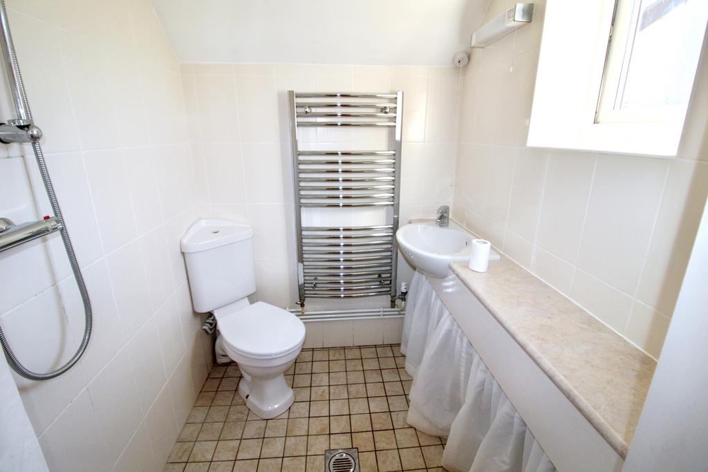 WETROOM/WC with tiled floor, fully tiled walls, heated towel rail, window, extractor fan and white suite with shower fitting and curtain rail, WC and washbasin. Wall strip light and shaver point.