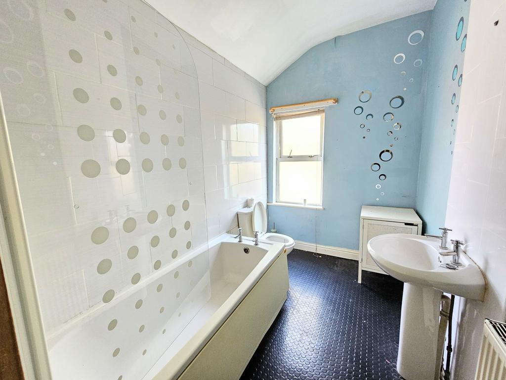 Having panel bath with shower over, wash hand basin and low level wc, part tiled walls and rear aspect double glazed window.