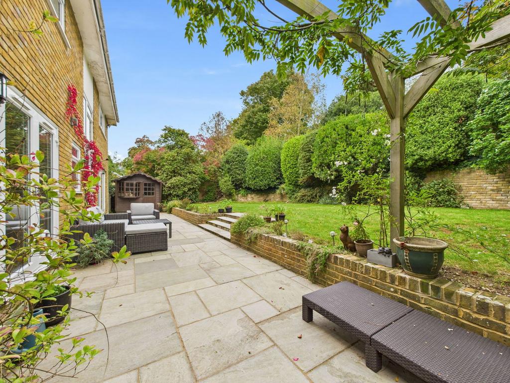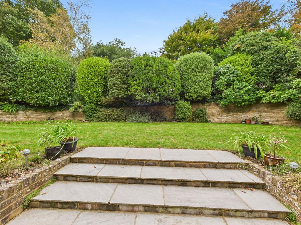 The rear garden is just as impressive — designed over two levels and offering both beauty and practicality. The first tier features an Indian sandstone terrace with a wisteria-covered pergola and raised flower beds, creating a charming, sheltered seating area. Steps lead up to an expansive lawn, divided by a hedge and wall for a feeling of privacy and seclusion, providing a superb space for children to play and for outdoor entertaining. An outdoor cupboard neatly houses the boiler.