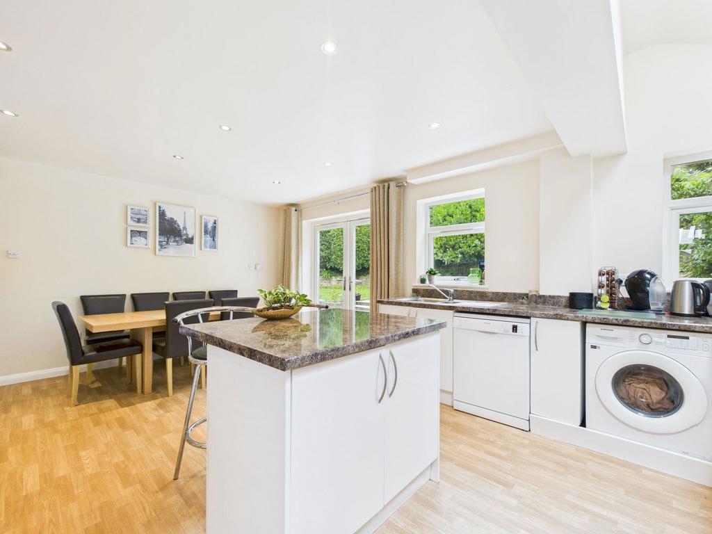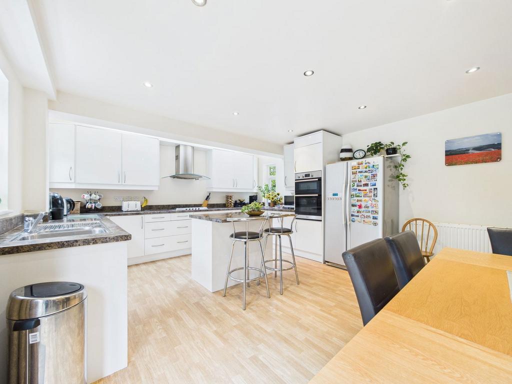 At the heart of the home lies the beautifully designed kitchen/dining room. This dual-aspect space is flooded with natural light, enhanced by two Velux windows and lovely views over the landscaped garden. Sleek, contemporary units provide excellent storage and house integrated appliances including a five-ring hob with extractor, mid-level oven and grill, with further space for an American-style fridge/freezer, dishwasher and washing machine. A central island offers additional workspace and casual breakfast-bar seating, while there is plenty of room for a large dining table, making this the perfect setting for family gatherings and entertaining. French doors lead directly to the garden, extending the living space in the warmer months.