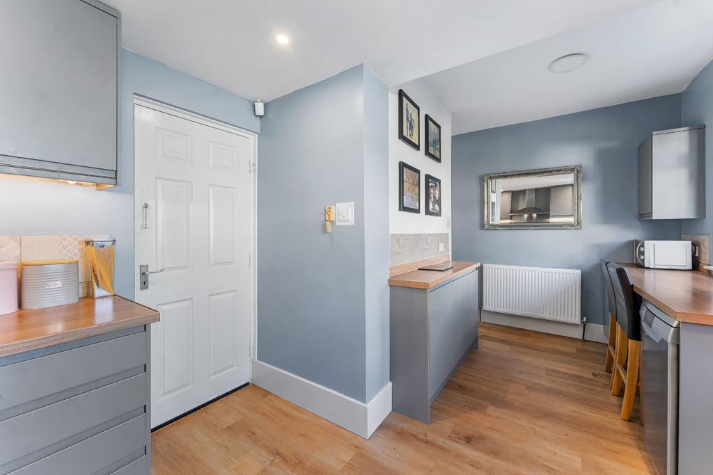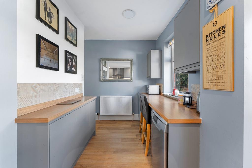 Wood laminate flooring. Breakfast bar. Plumbing for a dishwasher. Range cooker. Matte grey kitchen. Two double glazed units to rear with openers. Composite back door. Cupboard storage. Wood effect laminate worktops. Cream splashback tiles. Under-counter lighting. Stainless steel extractor. Composite black sink with chrome mixer tap. Ceiling recessed spotlights. Pendant light.