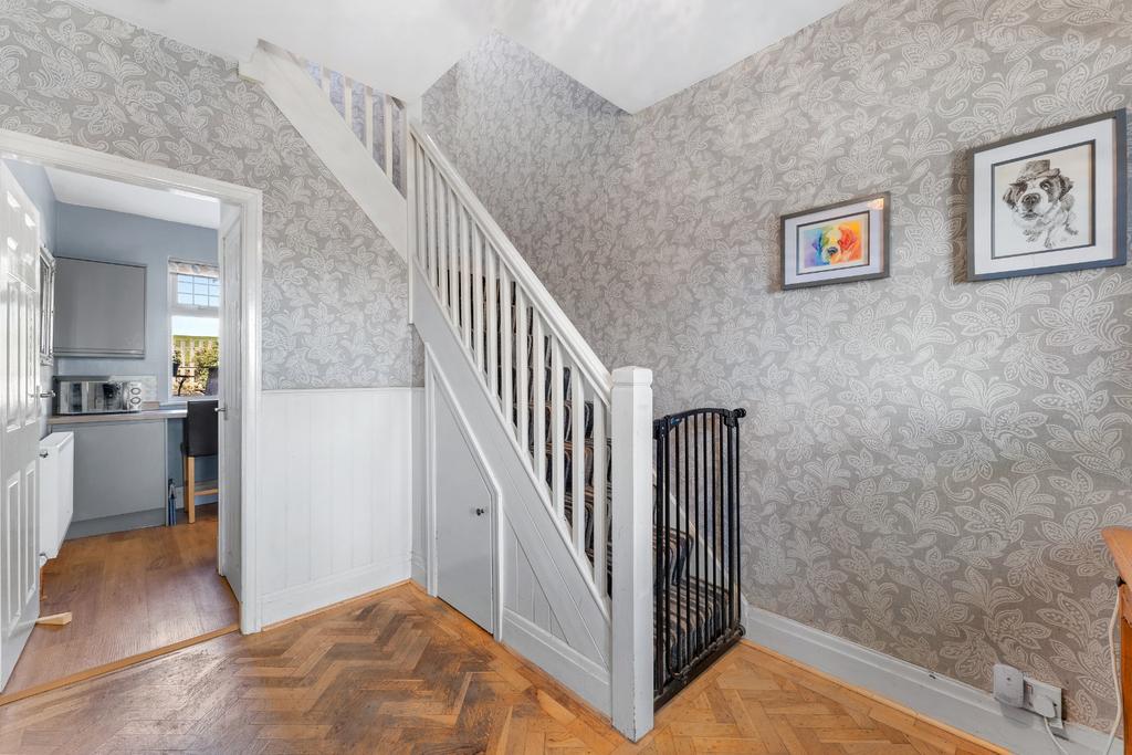 To the first floor, there are three well-proportioned bedrooms and a beautifully appointed family bathroom with P-bath, rainwater shower, vanity unit, and chrome heated towel rail.