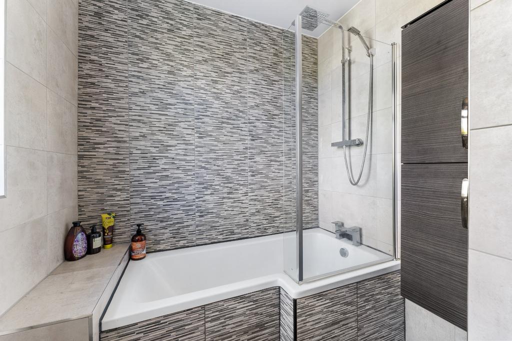 Vanity wall mirror cabinet. P-bath with glass shower screen and chrome bar power shower with rainwater head. Panelled ceiling. Ceiling recessed spotlights. Chrome heated towel radiator. Tiled walls. LVT flooring. White W/C. Sink vanity unit with cupboard storage and chrome mixer tap. Frosted double glazed unit with opener to rear.