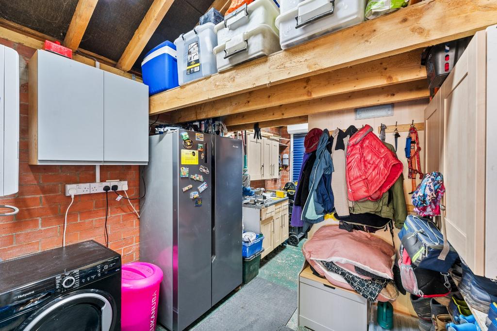 Electric door. Ideal combi boiler – 3 years old. Concrete flooring. Plumbing for a washing machine. Shelving.