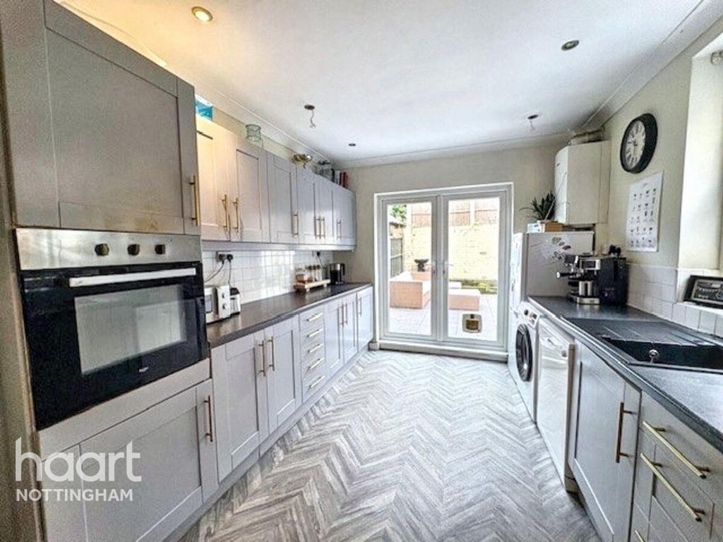 uPVC triple glazed window to side elevation, French doors to rear elevation, hard flooring, sink, splashback tiles, mixer tap, draining board, gas hob, oven, extractor hood, boiler, many base and wall units, spotlights to ceiling