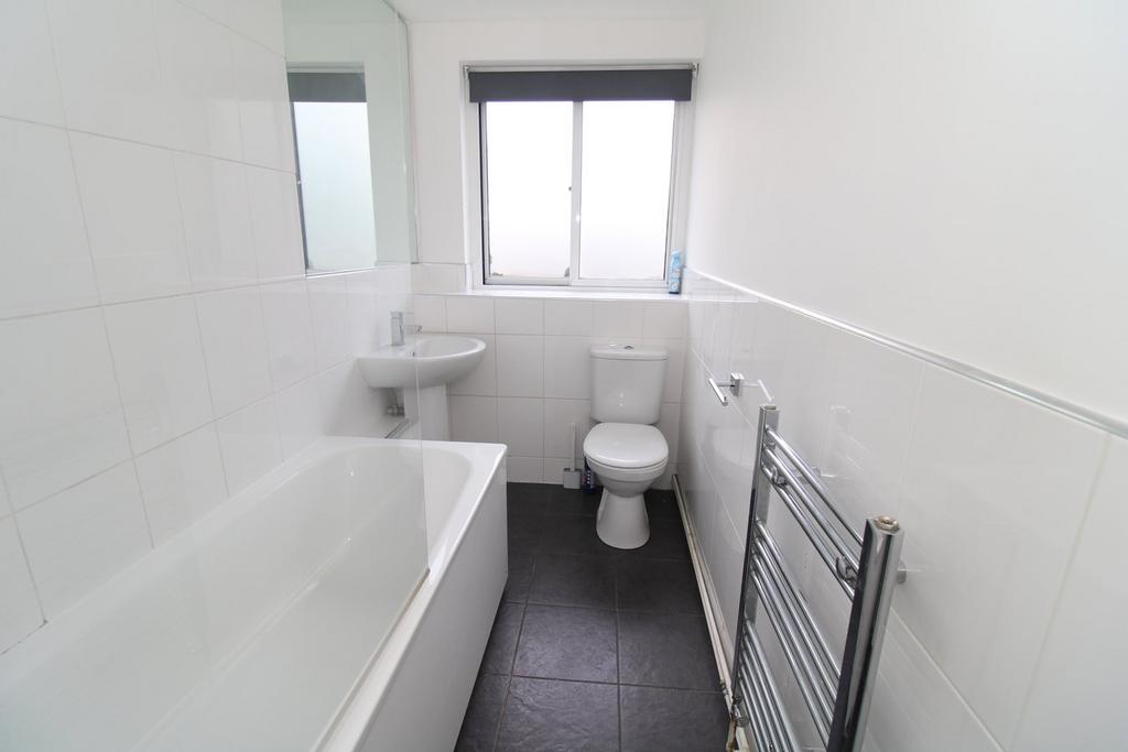 3.24m including door recess x 1.44m (10' 8" x 4' 9") Double glazed side window, appointed with a white suite of bath with a chrome mixer tap and wall mounted Mira Sport shower over to one end, pedestal wash basin and low level w.c., tiled walls to two sides of the bath otherwise part tiled walls, chrome ladder style radiator, tiled floor