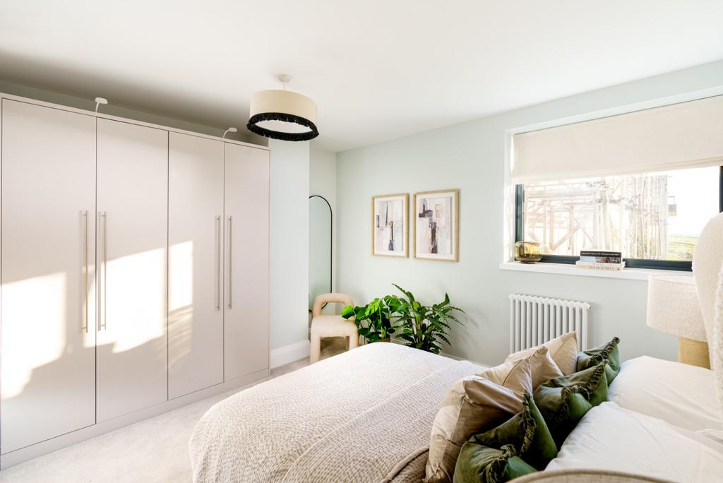 The kitchens feature ‘Regiment Green’ Shaker-style units, marble effect ‘Calacatta Grey’ Quartzstone worktops, brass boiling taps, and Neff appliances. In three-bedroom homes, a wine cooler and double oven completes this culinary haven.