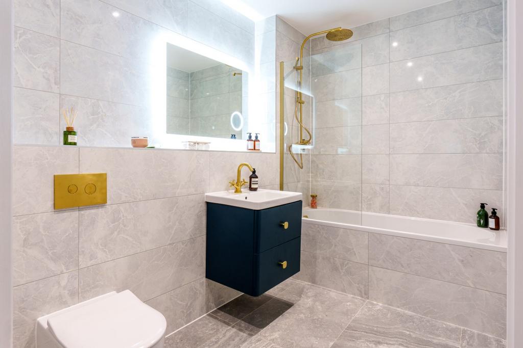 Bathrooms and en-suites combine sleek tiles, illuminated mirrors, heated towel rails, and underfloor heating with high-end Villeroy & Boch sanitaryware and Vado brushed gold brassware, creating spa-like spaces to unwind.