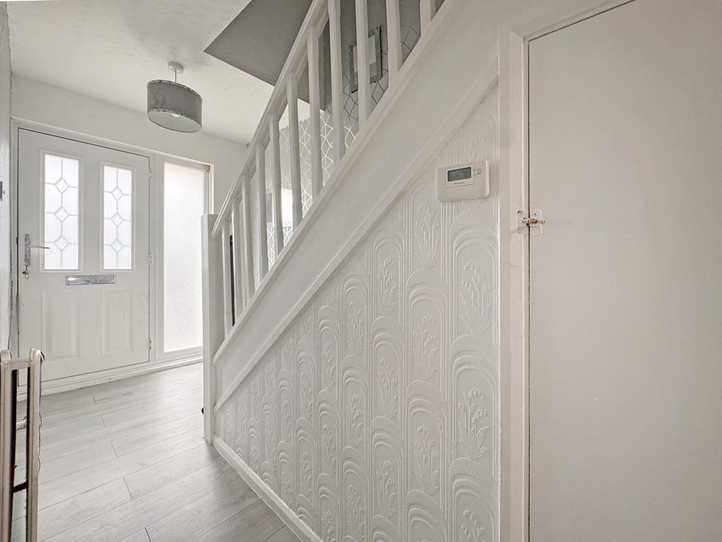 As you enter the home, you’re welcomed into a spacious reception hallway with a white spindle staircase flowing up the left-hand wall, grey laminate under foot and storage under the staircase to the rear.