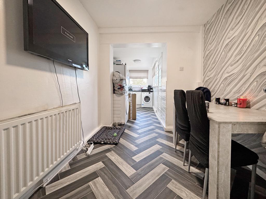 A doorway to the right leads through to a full aspect living and dining room, with large window to the front aspect, French doors to the rear, a wall mounted electric fire and laminate flooring.
