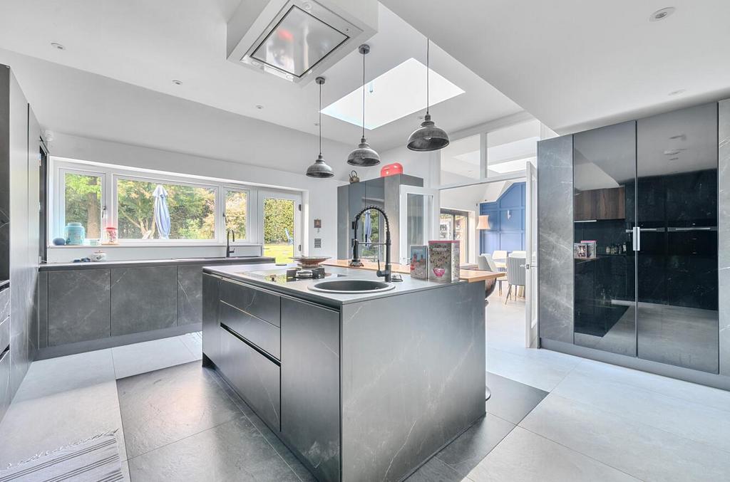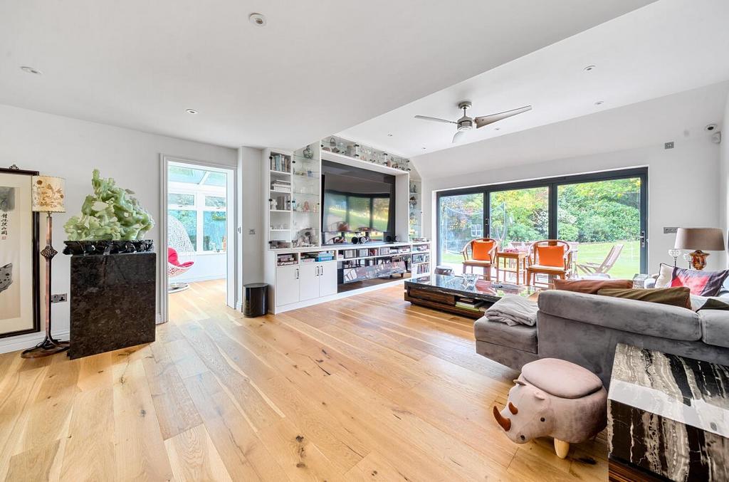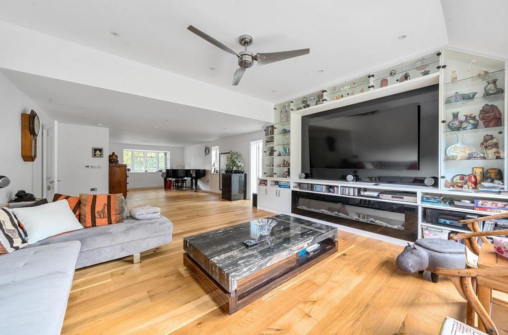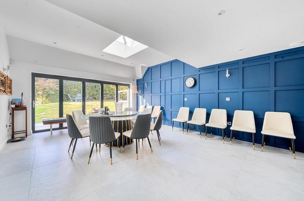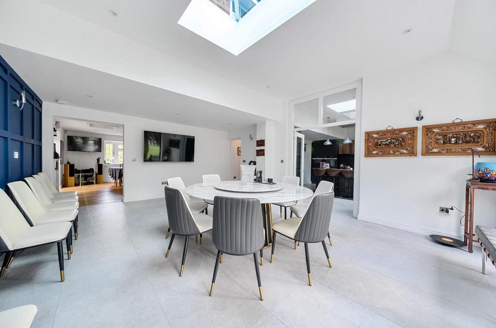 Internally, the heart of the home is the stunning open-plan kitchen and dining area, both flooded with natural light thanks to roof lanterns that create a bright and airy atmosphere. The German Schüller kitchen is equipped with top-of-the-line Miele appliances, providing a perfect space for family cooking and entertaining. Adjacent to the dining area is a further reception room that offers versatile living space, ideal for relaxing or hosting guests. Additionally, a large reception room with striking bi-fold doors and a media wall designed to accommodate a large television provides an excellent space for entertainment and family gatherings. Rebuilt as a versatile gym, the conservatory offers a bright and functional area. A well-appointed study is also situated on the ground floor, providing a quiet and productive environment. The home features four luxurious bathrooms, each fitted with high-specification stylish suites.