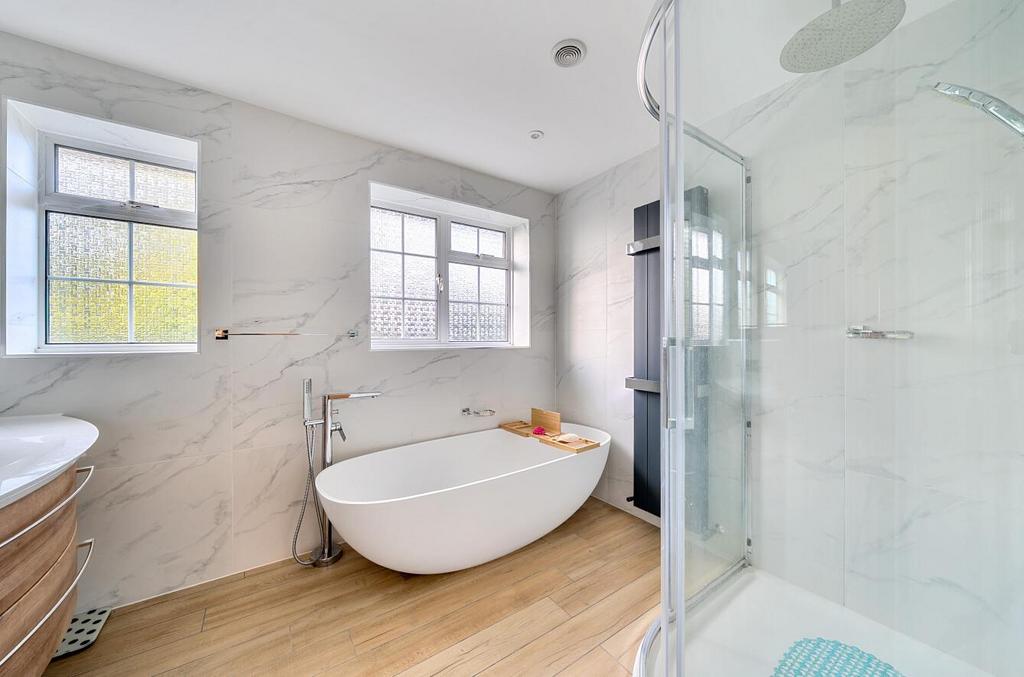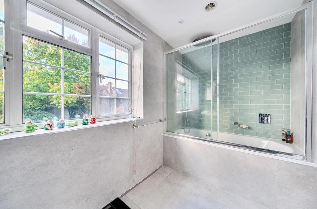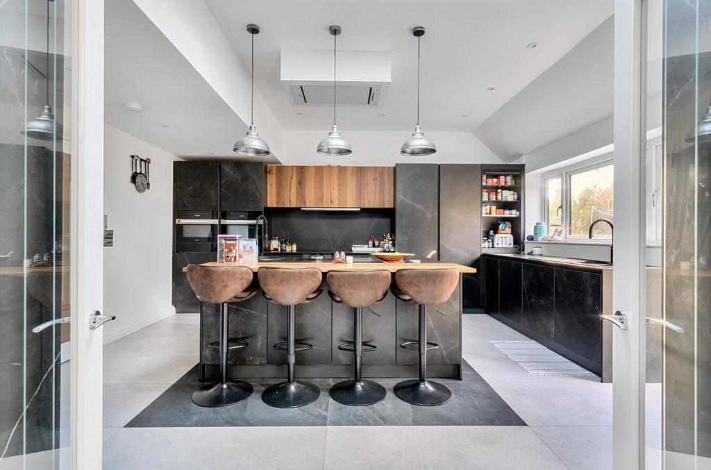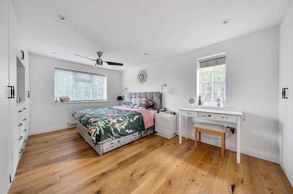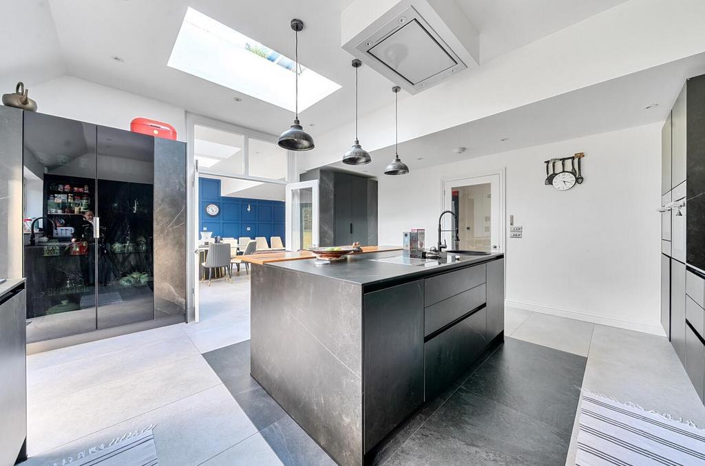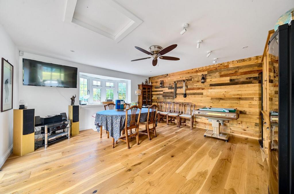 Internally, the heart of the home is the stunning open-plan kitchen and dining area, both flooded with natural light thanks to roof lanterns that create a bright and airy atmosphere. The German Schüller kitchen is equipped with top-of-the-line Miele appliances, providing a perfect space for family cooking and entertaining. Adjacent to the dining area is a further reception room that offers versatile living space, ideal for relaxing or hosting guests. Additionally, a large reception room with striking bi-fold doors and a media wall designed to accommodate a large television provides an excellent space for entertainment and family gatherings. Rebuilt as a versatile gym, the conservatory offers a bright and functional area. A well-appointed study is also situated on the ground floor, providing a quiet and productive environment. The home features four luxurious bathrooms, each fitted with high-specification stylish suites.
