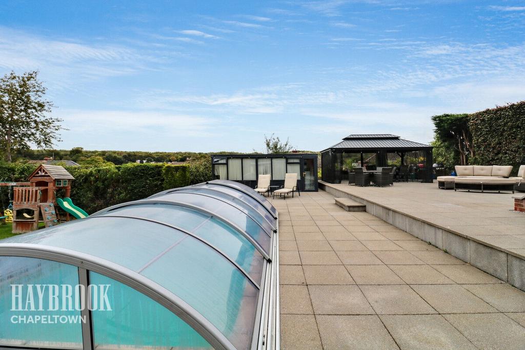 Set within generous grounds, the property offers ample parking for several family vehicles to the front. At the rear, a superb entertaining space features a mainly flagged patio, a detached outbuilding with double-glazed doors and windows, and a private swimming pool. An established lawn bordered by hedgerows provides additional greenery and a good degree of privacy, creating a versatile and inviting outdoor area for family life and entertaining.