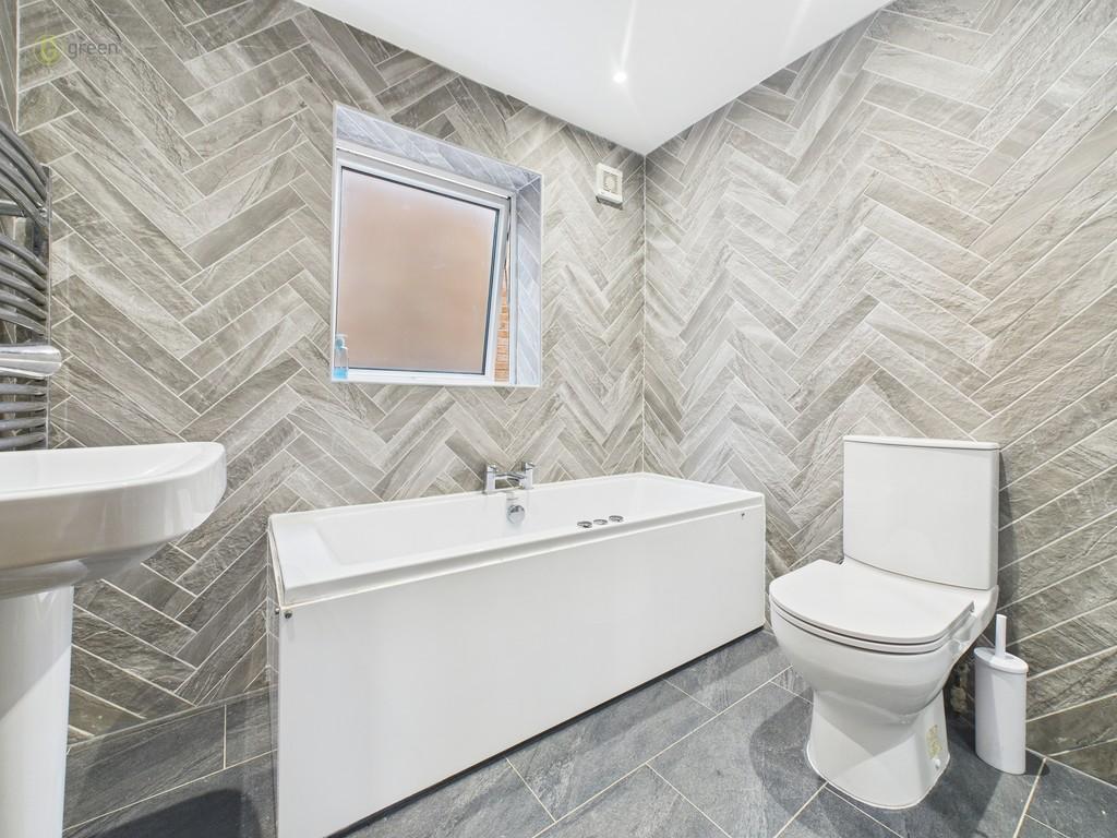 FAMILY BATHROOM Being luxuriously reappointed with a four piece white suite, comprising jacuzzi panelled bath with jacuzzi body jets, chrome mixer tap, low flush WC, full complementary tiling to walls and floor, chrome ladder heated towel rail, down lighting, extractor, fully tiled double walk in shower cubicle with mains rain water shower over and shower attachment and opaque double glazed window to side elevation.