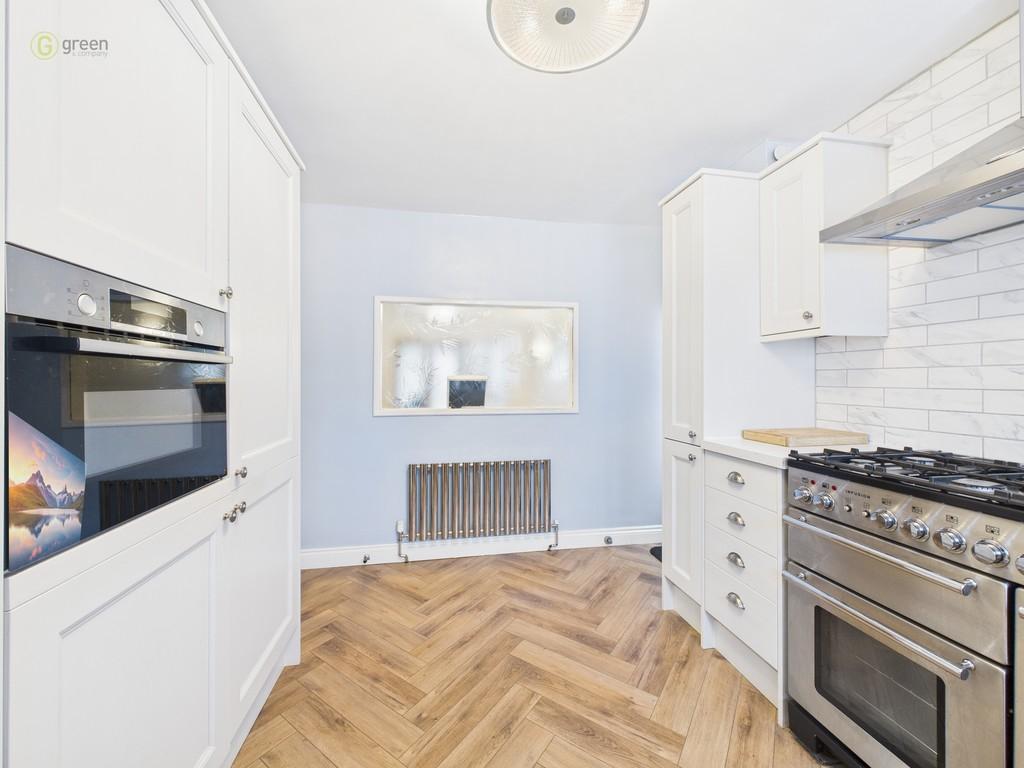 KITCHEN Being refitted with a comprehensive matching range of Howdens wall and base units with work top surfaces over incorporating one and a half bowl sink unit with mixer tap, brick effect tiled splash back surrounds, fitted Rangemaster stove with double oven and grill with plate warmer and five burner gas hob with double extractor hood above, integrated combination microwave oven, integral fridge/freezer, integrated dish water with LBT flooring, feature designer radiator, double glazed bay window to front and opaque double glazed door giving access to side.