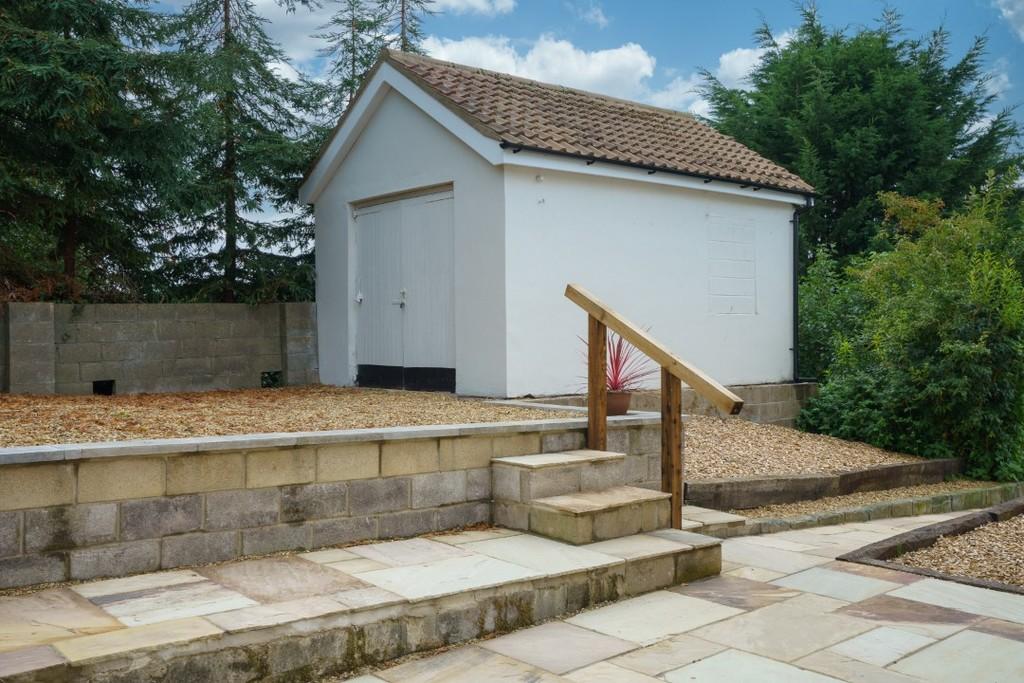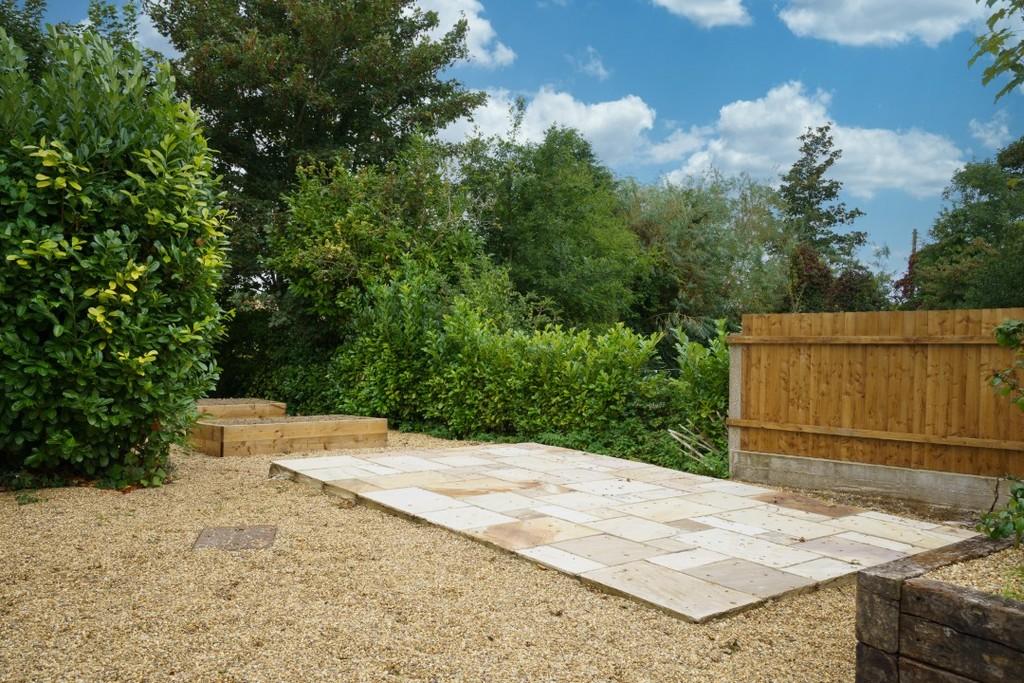 - The Garden includes Patio Areas and Raised Vegetable Beds