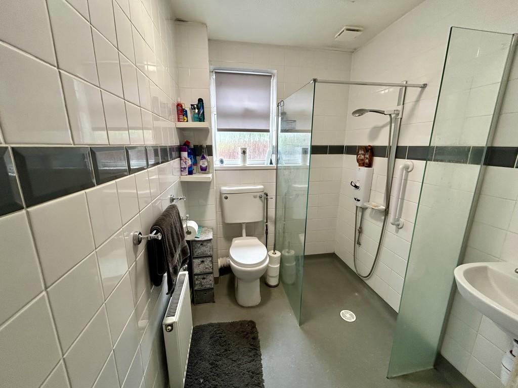 A recently refurbished shower room is fully tiled and comprises a walk in shower enclosure, close coupled WC and wash hand basin