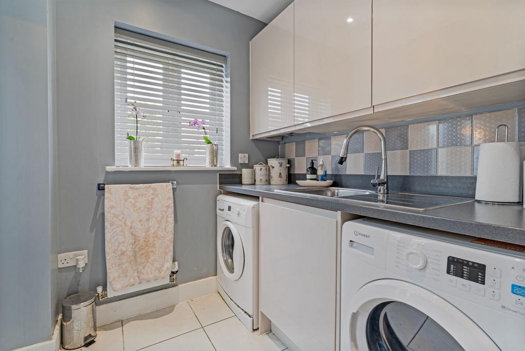 The double aspect living room is bright and spacious, with patio doors opening directly onto the garden. The kitchen diner is a real showstopper: a sleek and practical space with ample room for a large dining table, a breakfast bar for casual meals, and a wide range of high quality integrated appliances including two fridge freezers, a built-in microwave, a double oven, five-ring gas hob and dishwasher. The clever design includes the original rear window now repurposed as a serving hatch into the sun room, perfect for entertaining. A utility room provides additional space for laundry, with plumbing for a washing machine, a dryer and a sink, while a ground floor cloakroom completes the accommodation on this level.