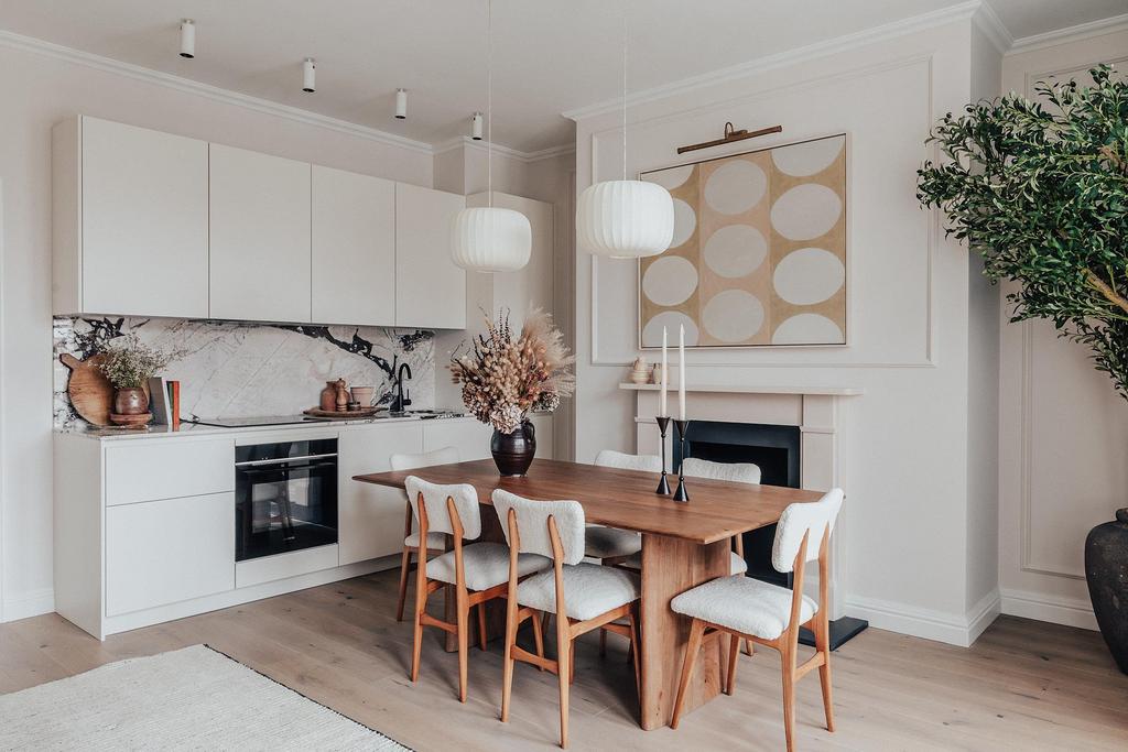 The open-plan kitchen, living and dining area has been finished with a modern white kitchen, marble splashback and integrated appliances, creating a practical and contemporary layout.
