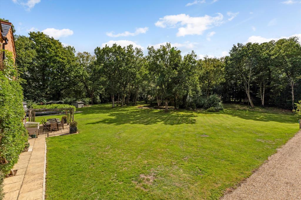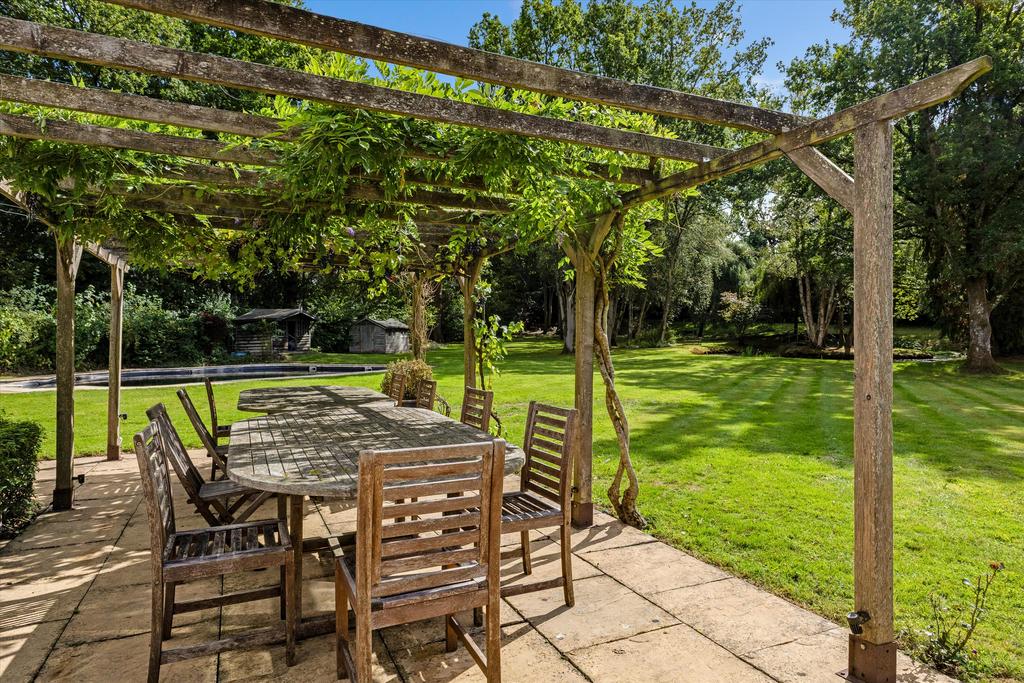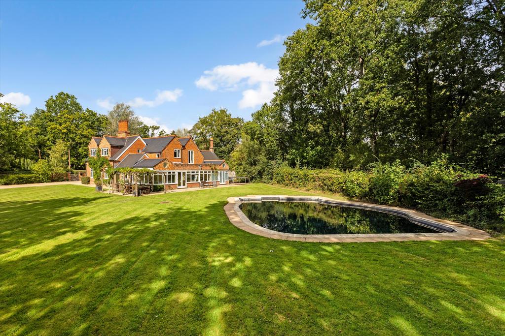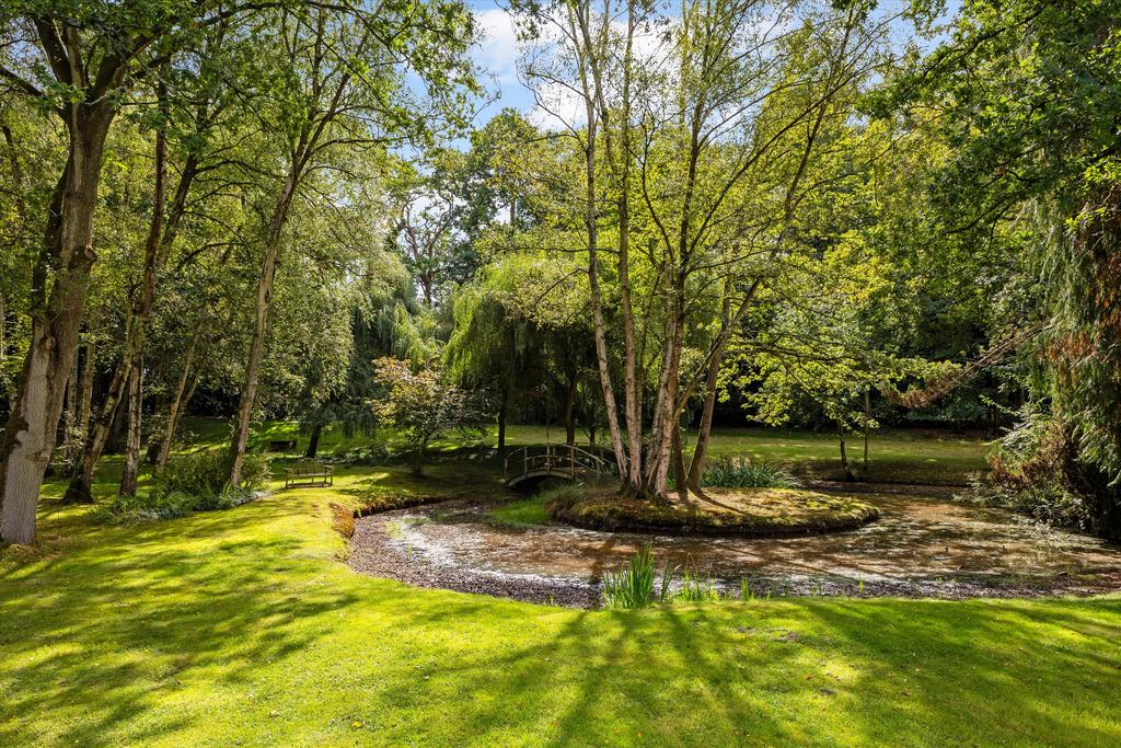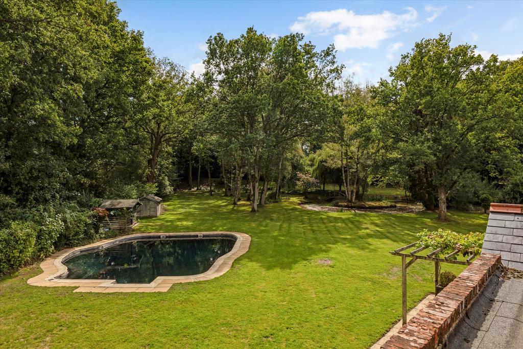 The property is approached through wooden gates, leading down a private drive flanked by an attractive front garden. There is ample parking and a double garage. The gardens are a true highlight – mature, private and beautifully maintained. To the side of the house is a large terrace ideal for al fresco dining beneath a wooden pergola. A spacious lawn area is bordered by mature trees, offering peace and seclusion. Within the garden, is a swimming pool, a pond with a charming wooden bridge leading to a small island and several garden sheds.