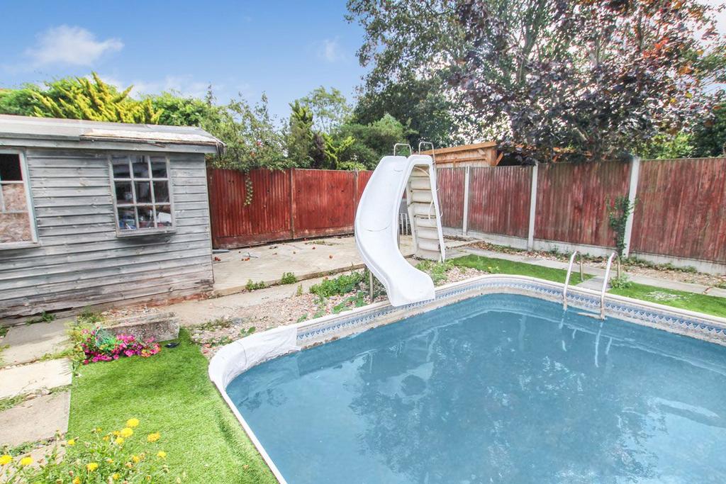 Outside, the rear garden is designed for entertaining, with a large patio seating area and a swimming pool at the rear. A driveway to the front provides parking for multiple cars.