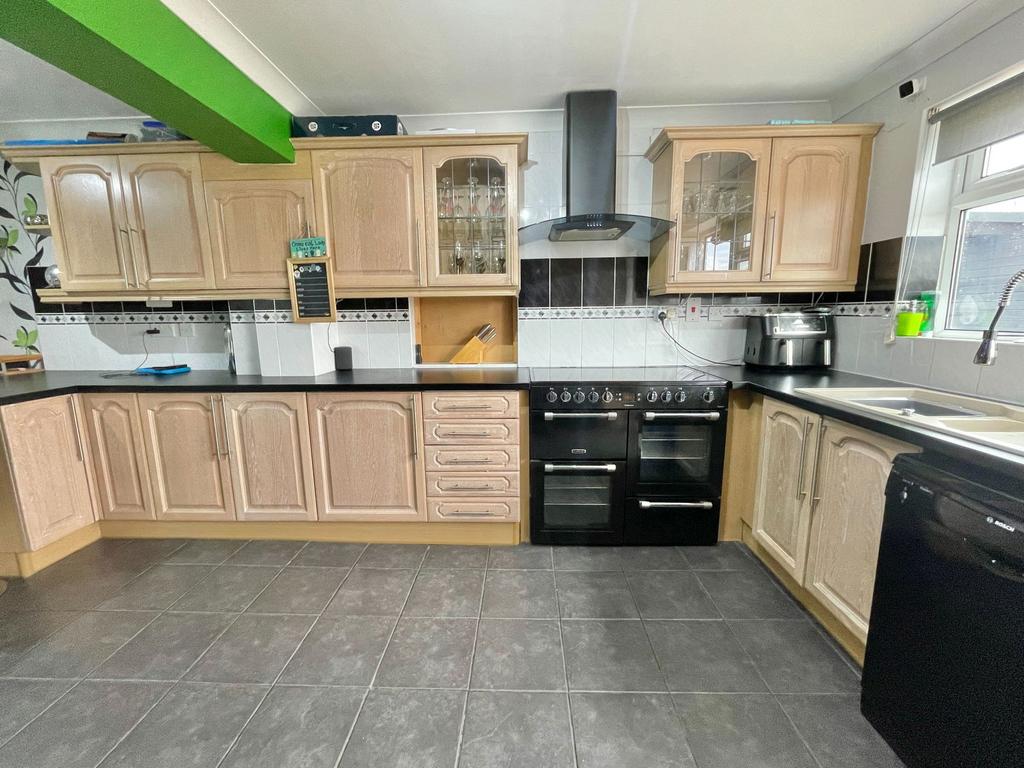Window to rear, wall and base cupboards, display cabinets, fitted worktop lights plus fitted worktops with 1 1/2 sink, tiled splashback and surround, plumbing for washing machine, dishwasher, and dryer, space for range cooker with fitted extractor hood, fitted breakfast bar / dining platform area, fireplace with multi fuel woodburning stove, and back door leading into rear garden.