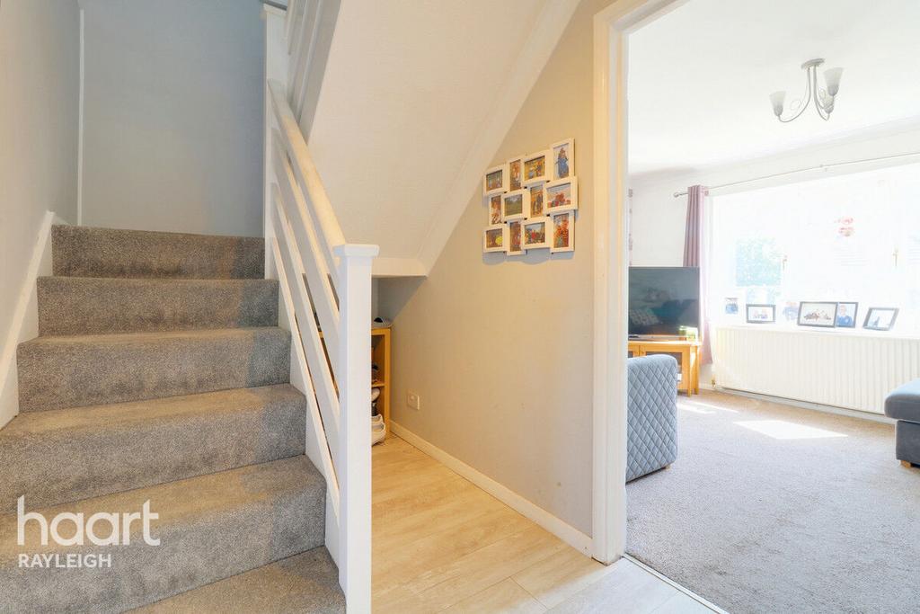 Door opening in to hallway with laminate flooring, radiator, stairs to first floor, doors to: