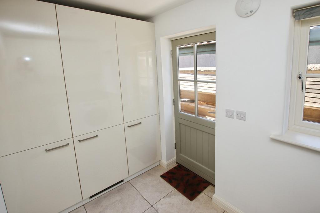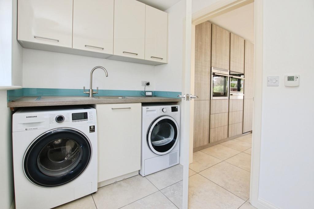 Tiled flooring continues into the utility, which includes a full-length integrated freezer, space and plumbing for washing machine and separate dryer, sink with drainer, wall and base units, and back door to the garden.