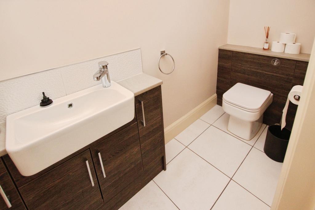 With tiled splashbacks, sink, WC, storage, and extractor.