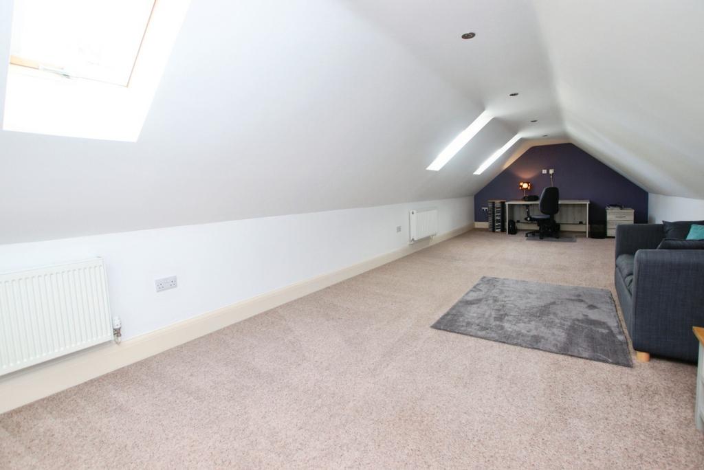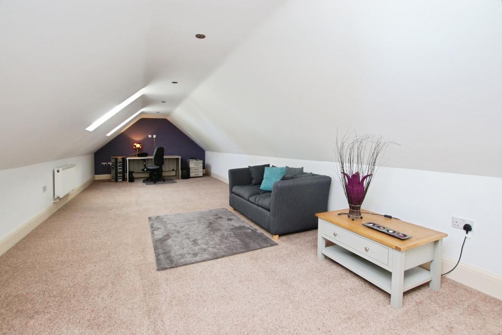 A vast and versatile top-floor room with eaves storage, skylights, carpet, and sockets perfect as a teenager’s retreat, home office, or studio. Was previously used as a home cinema.