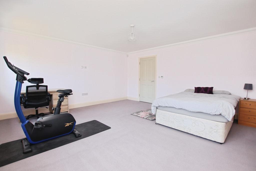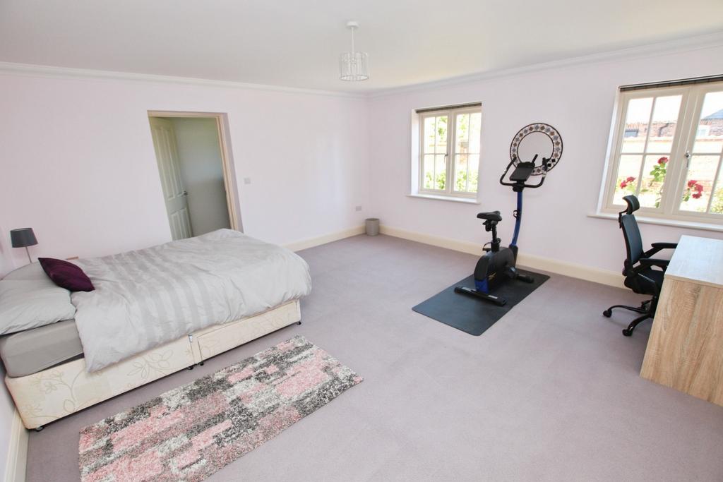 A large, carpeted room with two front-facing windows and a walk-in wardrobe/storage area with scope for conversion to an en suite (STPP)