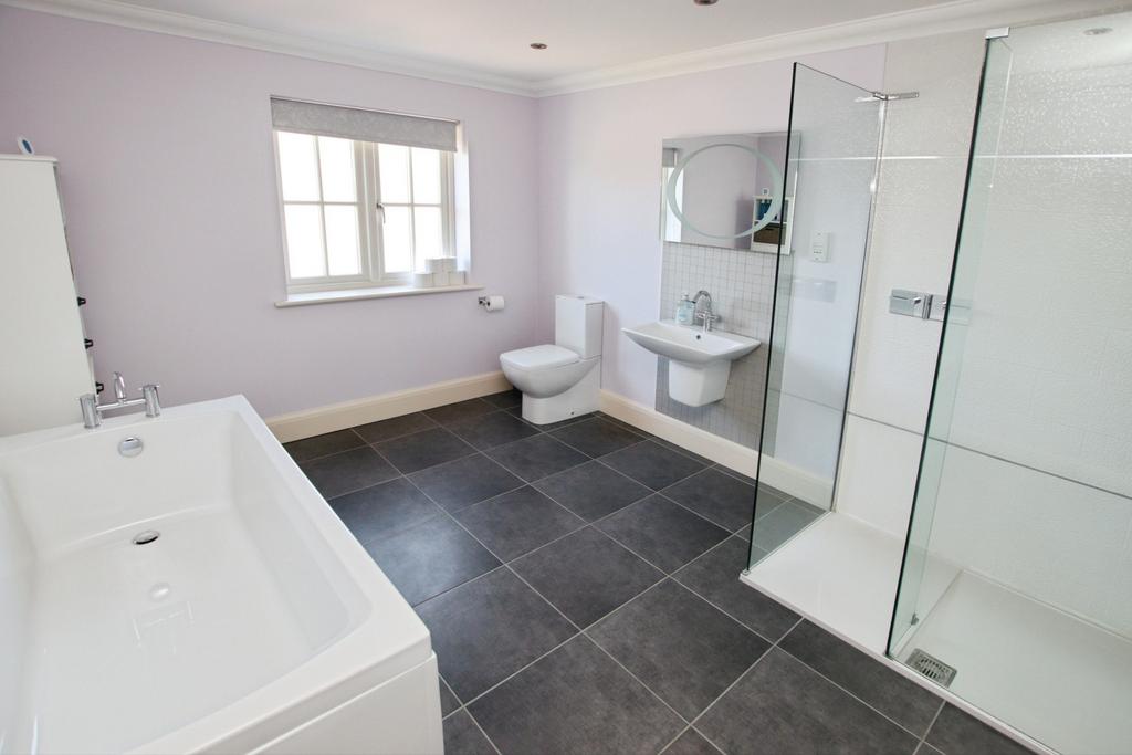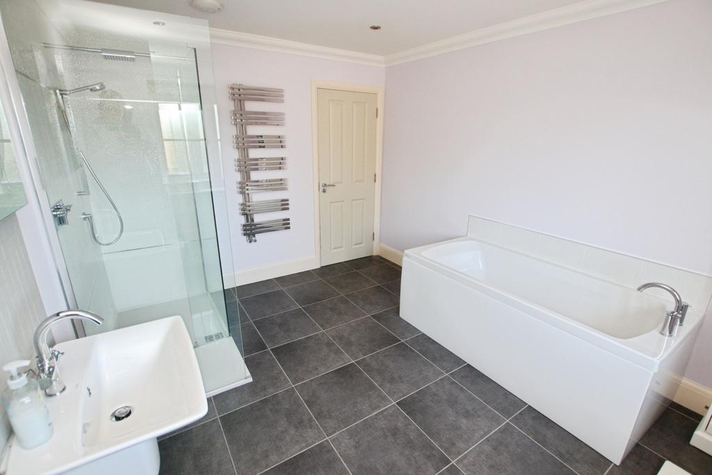 Tiled, with bath, separate shower, sink, WC, warm up electric underfloor heating and towel radiator.