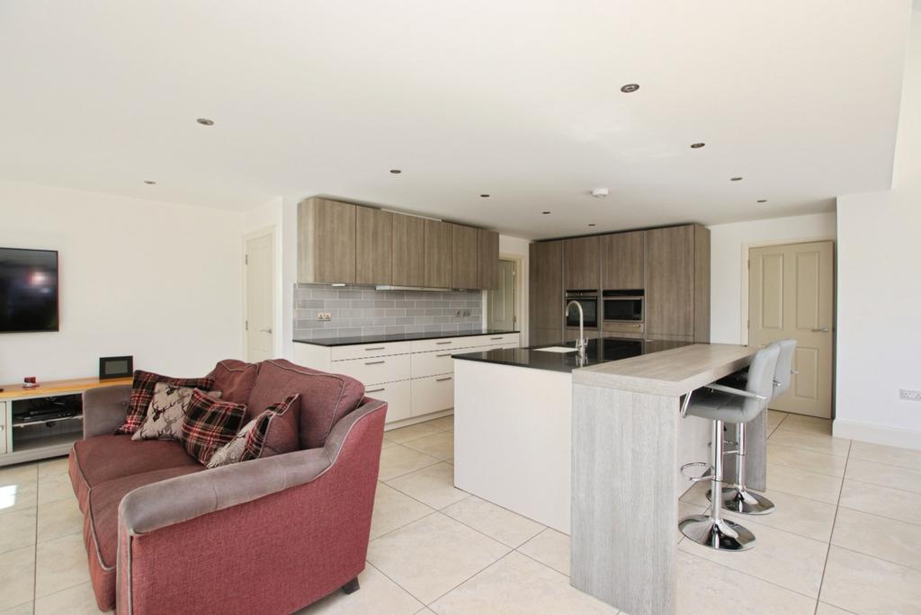 This stunning open-plan space features tiled flooring, skylights, bifold doors, and full-height windows, a true heart-of-the-home. Zoned into dining, lounge, and kitchen areas, it includes a feature fireplace, a large breakfast island with wine cooler, NEFF five-ring induction hob and extractor, NEFF oven, Hotpoint microwave oven with warming drawer, and Myra Stone worktops. There’s ample storage via wall and base units, plus a full-length fridge.