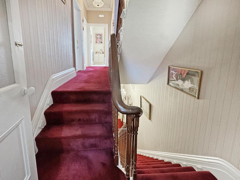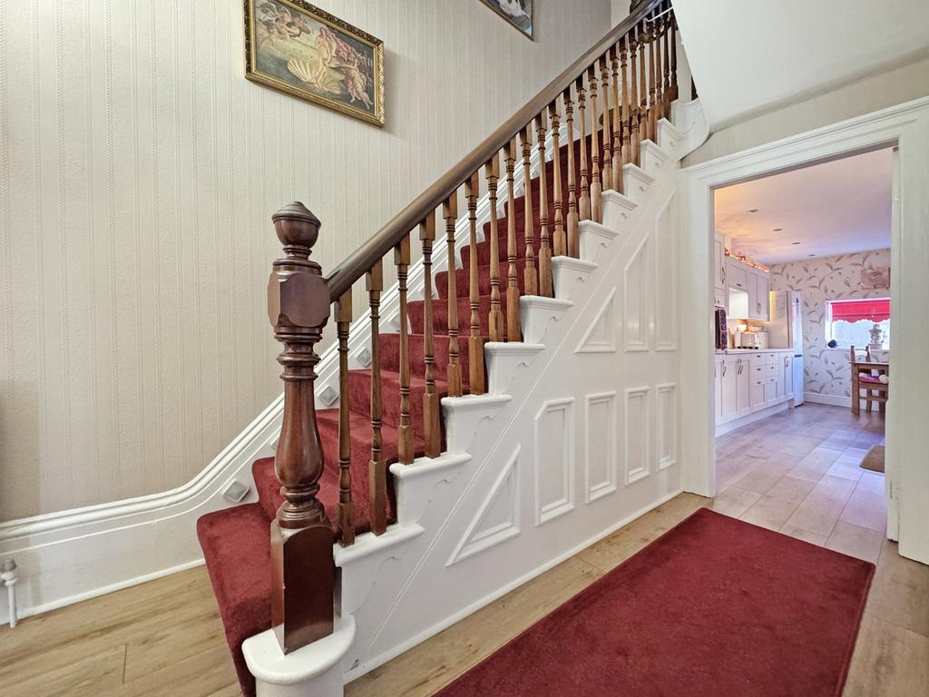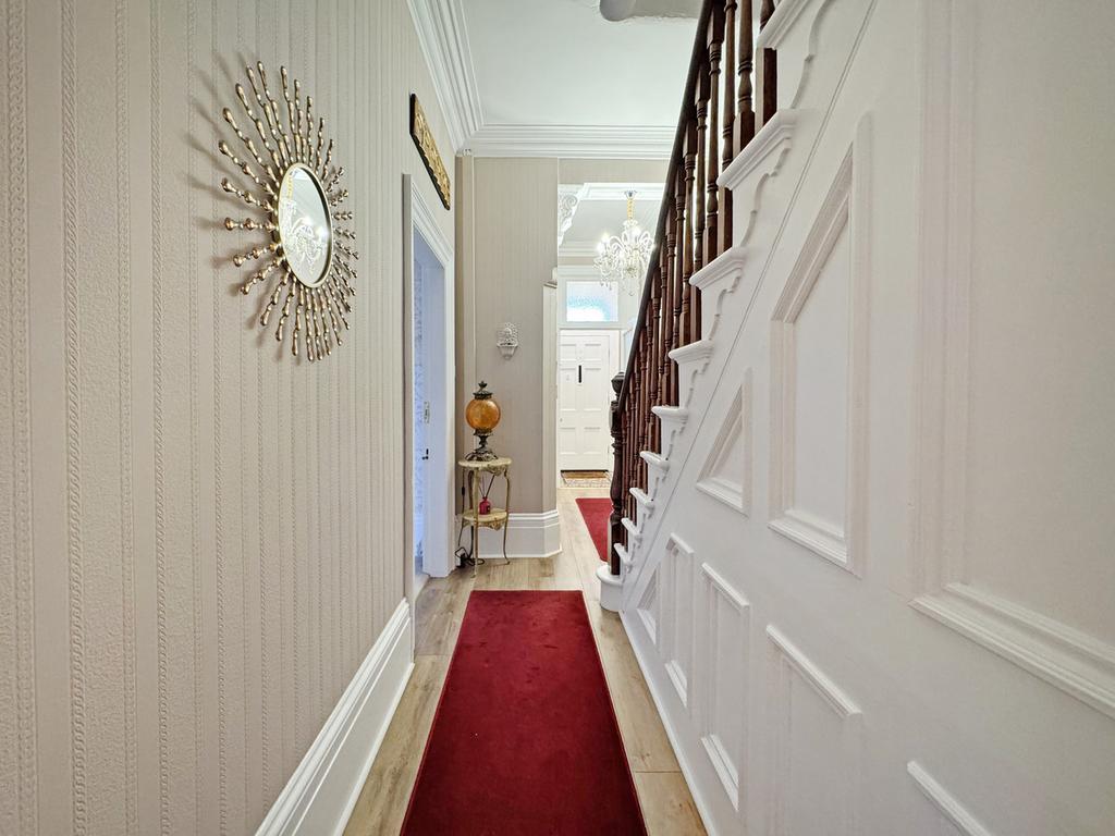 As you enter the home, you’re initially welcomed into a vestibule with Victorian inspired floor tiles and a half-glazed doorway leading directly into a spacious hallway. The hallway is beautiful and sets the tone for the remainder of the home, with a a wood spindle staircase and side panelling.