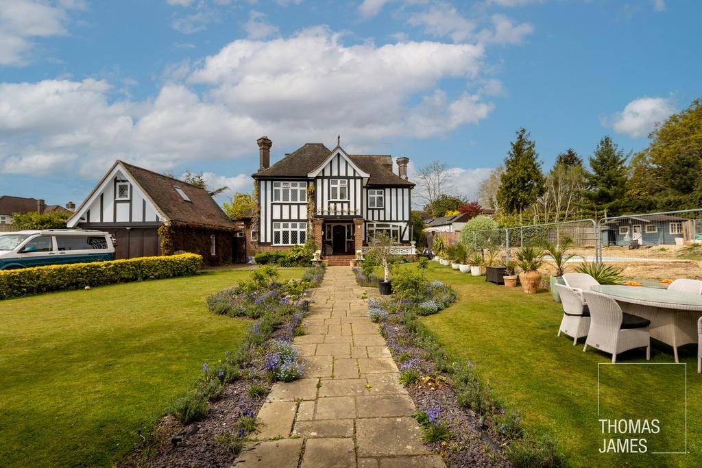 Occupying a secluded ⅓ acre plot on a quiet one-way lane, this exceptional 2,975 sq ft detached Arts & Crafts home combines timeless character with modern comforts and comes with full planning permission for a striking 3,896 sq ft contemporary detached house.