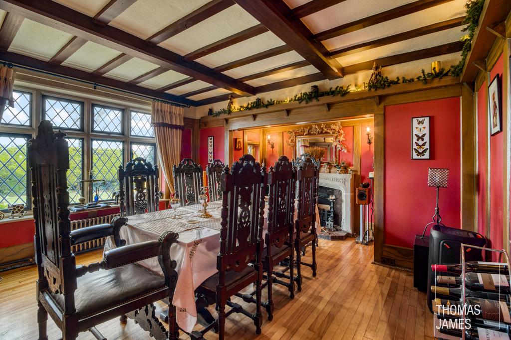 The existing five-bedroom property features exudes Arts & Crafts charm with classic period details including leaded windows, timber beams, a Gothic-arched door, and a wide Colonial-style porch. Inside, original wood floors, panelling, and generous proportions create a warm, elegant feel across three floors, with beautifully landscaped gardens front and rear.
