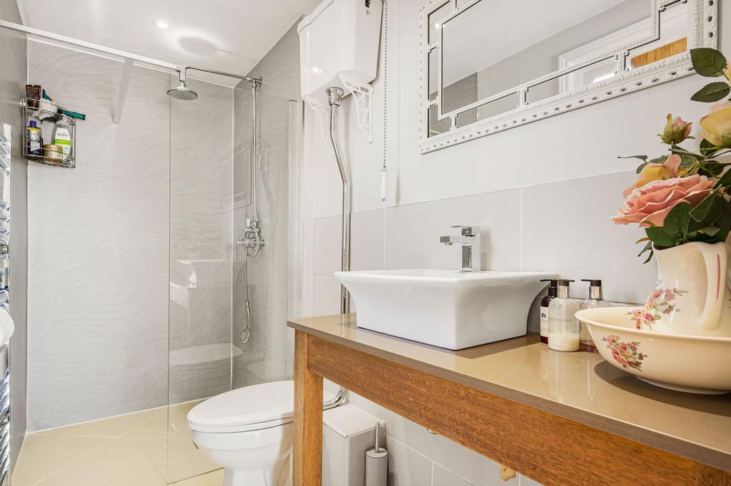 With tiled flooring, walk-in shower enclosure, high-level W.C., wash basin, opaque window to front, heated towel rail and recessed lighting.