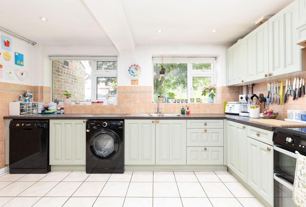 Another part-glazed door leads through to the dual-aspect kitchen/diner. This is a practical and versatile space that could benefit from a bit of a refresh. The pale-green cabinets provide plenty of storage and there is space for appliances including a cooker, fridge-freezer, dishwasher and washing machine. There is room for a table and chairs, and a patio door gives direct access to the garden, making this a natural hub of the home that could easily be refreshed into a stylish and modern kitchen/diner.