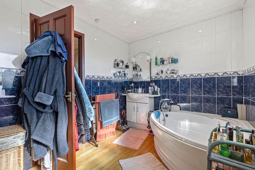 Five piece suite comprising a corner shower, corner bathtub, low level w/c, bidet and wash hand basin. Wood effect laminate flooring. Tiled walls. Ceiling spot lights. Radiator. uPVC double glazed frosted window to rear.